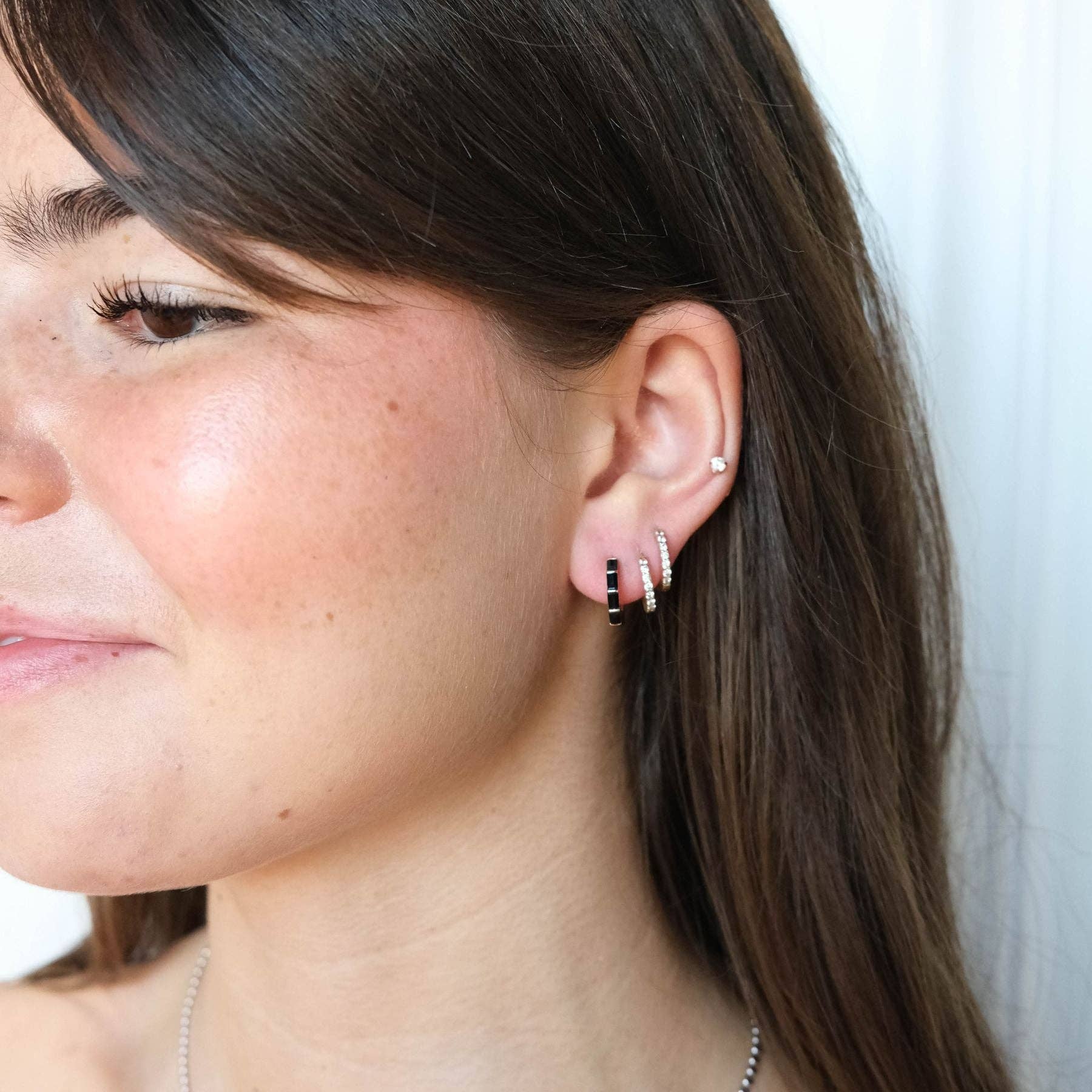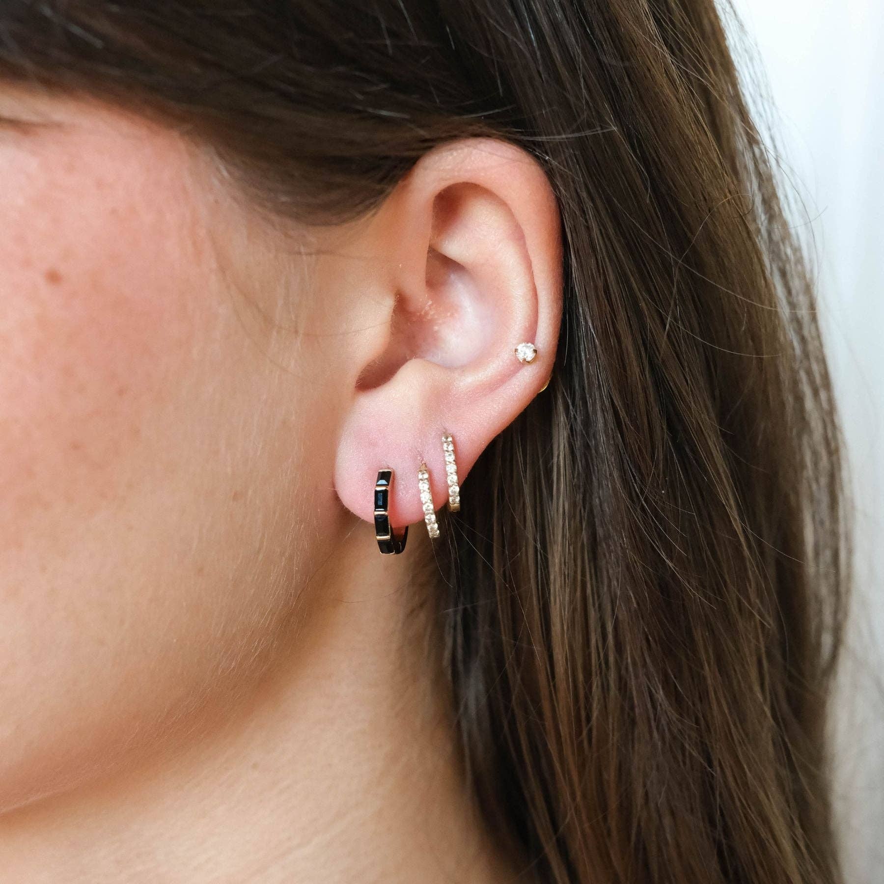Our Black Crystal Baguette Huggies feature four sparkling glass stones set in 14k gold plating or silver plating. These studs are the perfect earring for effortless wear and comfort!