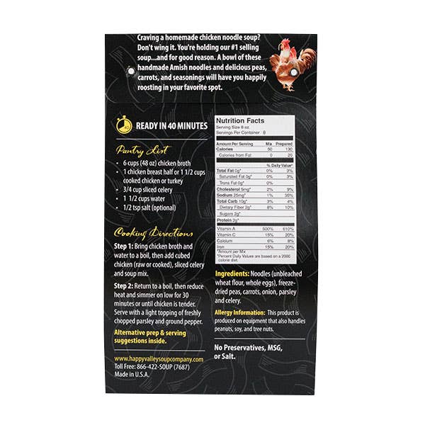 Craving a homemade chicken noodle soup? Don’t wing it. You’re holding our #1 selling soup…and for good reason. A bowl of these handmade Amish noodles and delicious peas, carrots, and seasonings will have you happily roosting in your favorite spot.