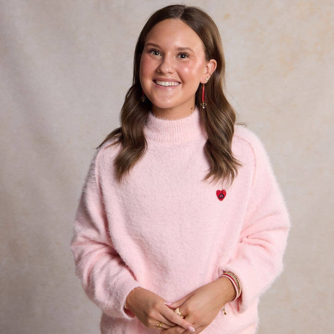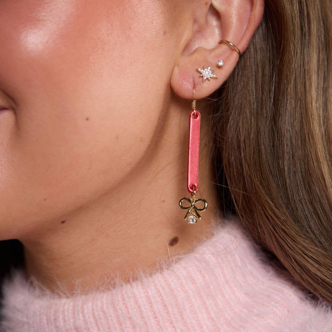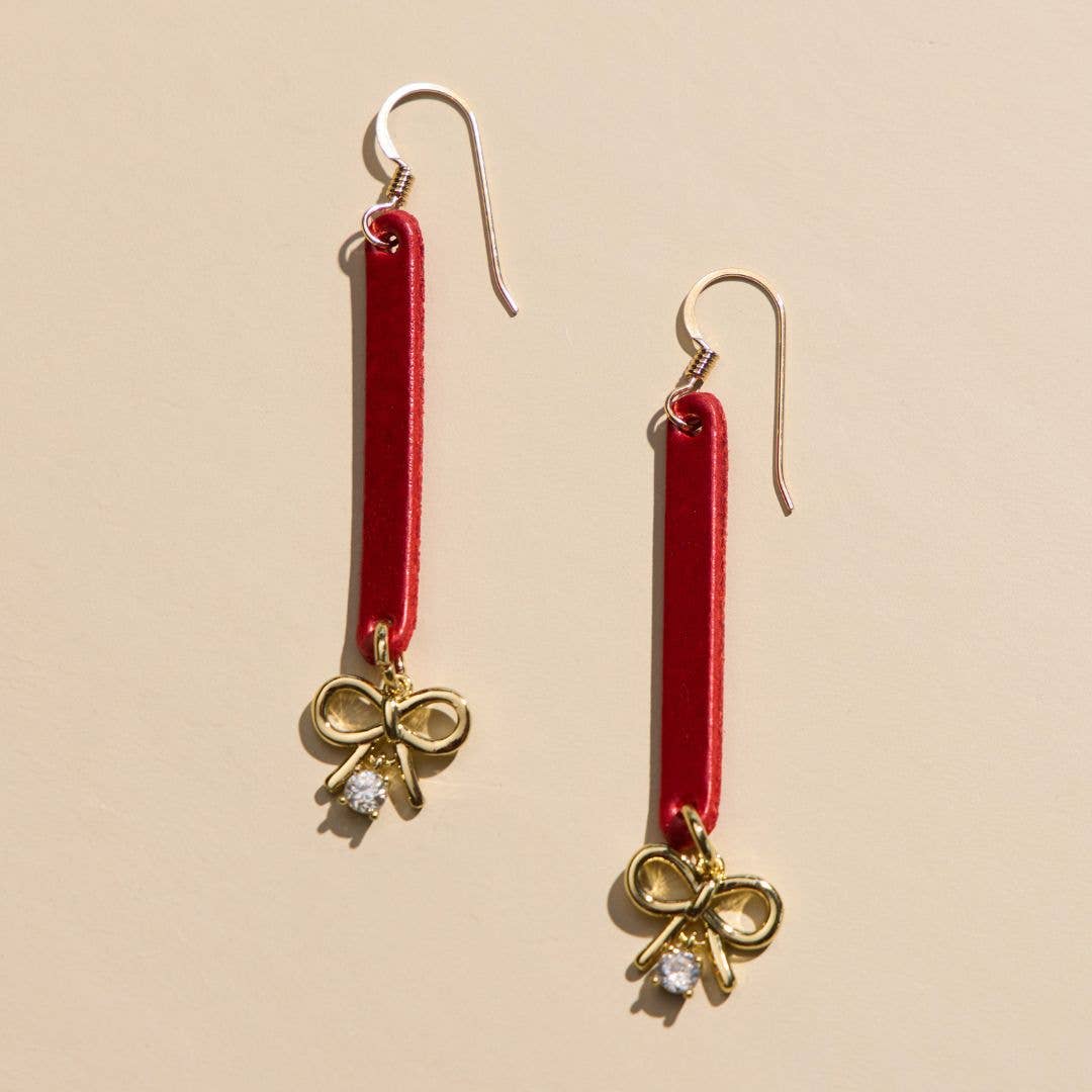The Crimson Shimmer Kate features a gold bow and CZ charm attached to a strip of our crimson shimmer leather. This earring is a must-have for your holiday party look!