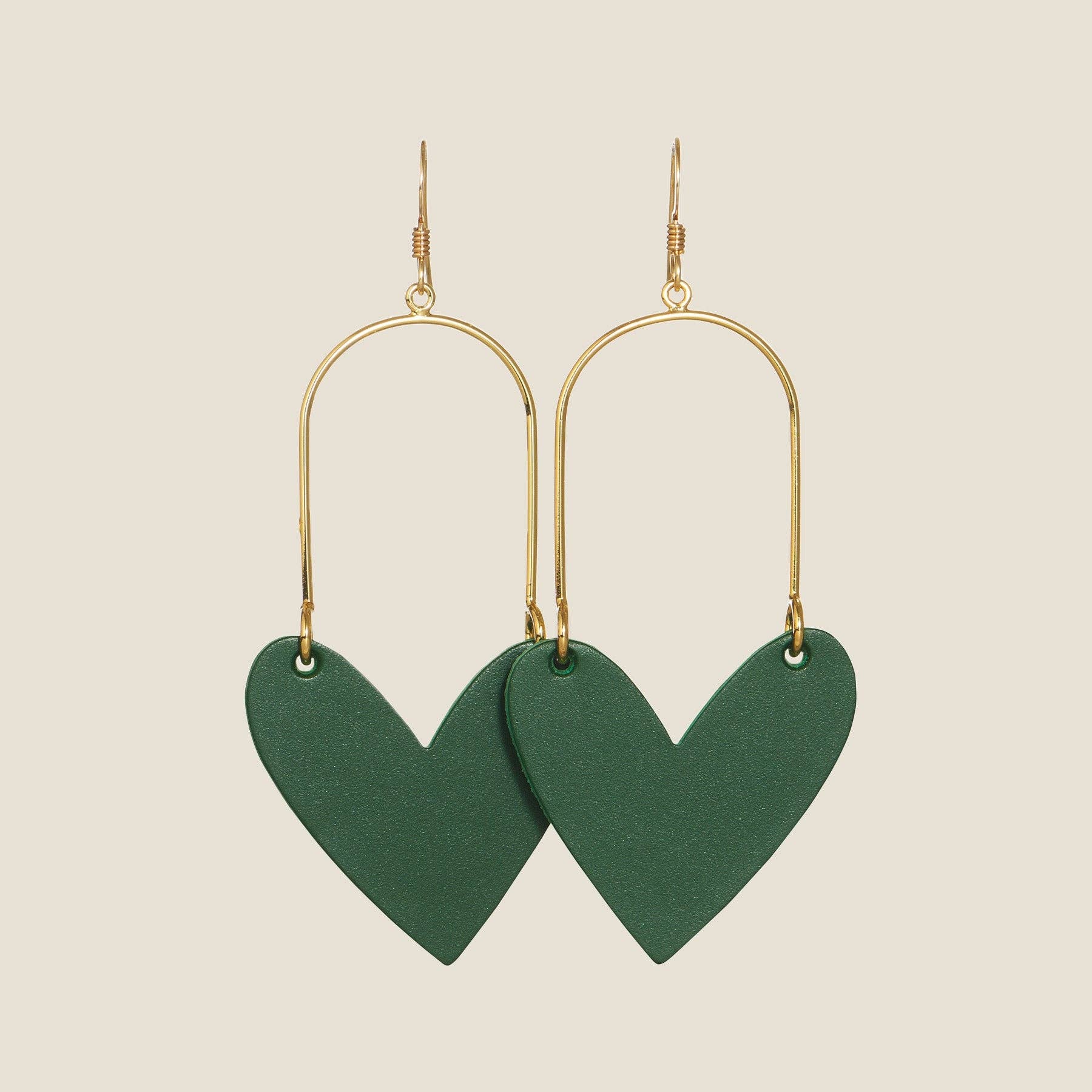Evergreen Sweethearts feature our smooth, deep green leather in our patented heart statement shape. These lightweight statement earrings are attached to gold or silver hoop hardware for optimum style and weightlessness.