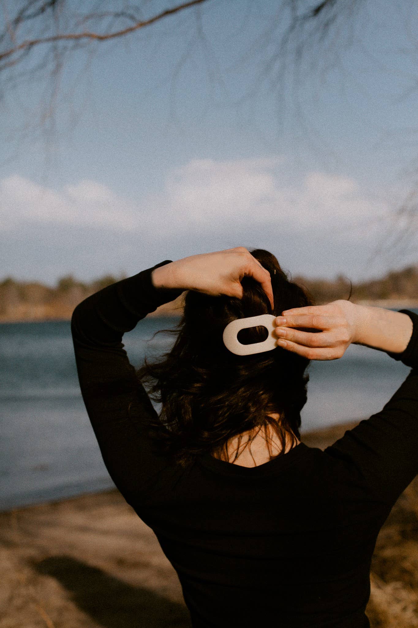 Lay flat and relax with the new TELETIES Almond Beige Small Flat Round Hair Clip in Beige. This hair clip is designed to allow you to lay back flat, do yoga, or sit comfortably in a seat with a headrest, and it is made with the same material that is nearly unbreakable.