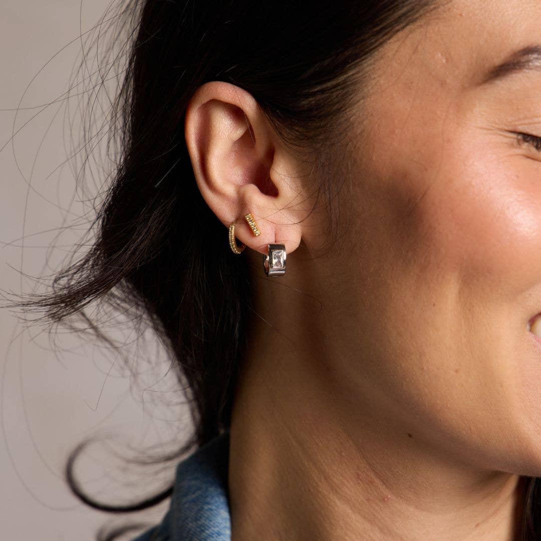 These rhodium-plated baguette bezel huggies feature a shimmering baguette cut stone in a sleek bezel setting, perfect for everyday wear and effortless modern style. Wear them alone for a minimalist look or stack them for a stylish statement.