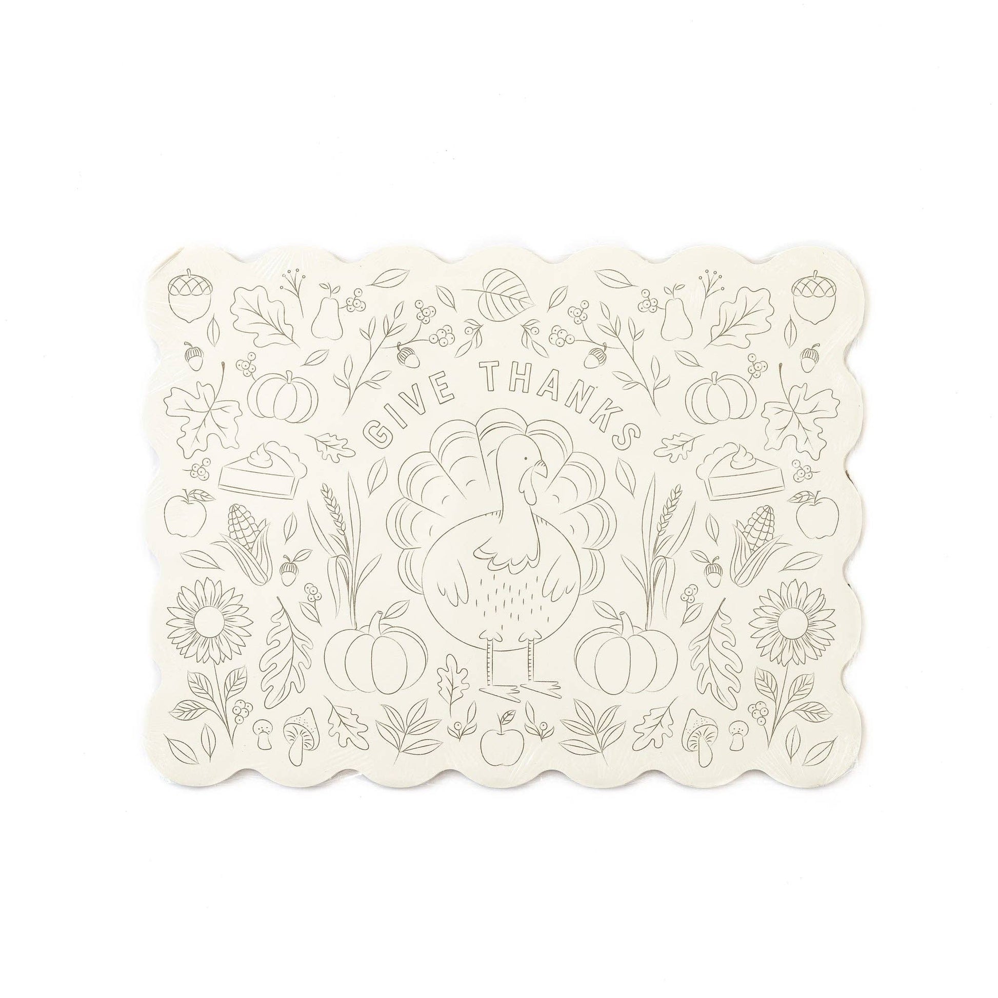 Make the kids' table the place to be with these festive coloring placemats. Featuring a whimsical turkey and festive sentiment "give thanks" these placemats are sure to be a favorite focal point of your Thanksgiving table for your loved ones both young and old!